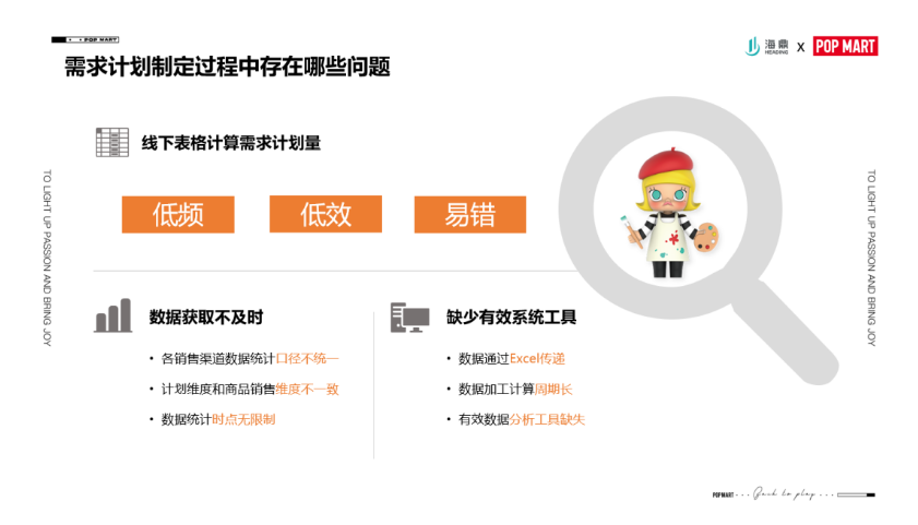 剛才很榮幸聽了陽總關于生鮮便利店的分享。下面我主要把泡泡瑪特和海鼎這半年來圍繞商業智能管理系統供應鏈信息化這塊的工作跟大家做一個匯報。